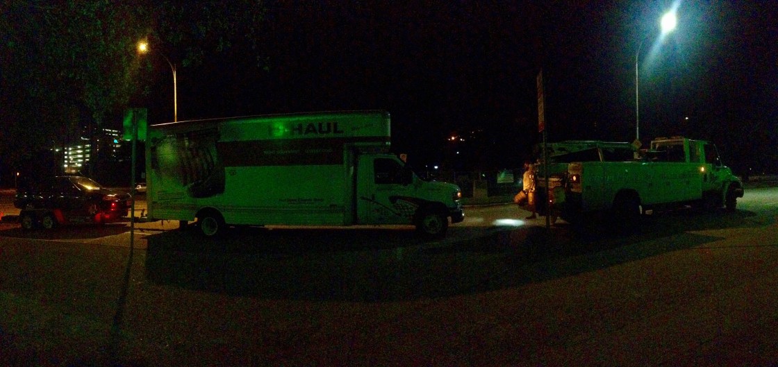 It was then I knew we were in for a long night. Cody’s friend Chris showed up. He’d been in Austin visiting friends and kept us company while Zach played phone tag with the U-Haul hotline. Becca stretched out on her yoga mat. Rufus was restless. I put my headphones on and tried to tune out the situation. It didn’t work.