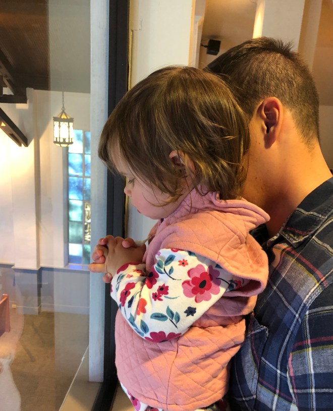 So, when we were in the base chapel’s cry room a few weeks ago, her actions during prayer time shocked me. Abigail didn’t reach for our hands. She folded her own, closed her eyes, and bowed her head. Zach and I weren’t even doing that at the moment. It was unexpected and amazing.