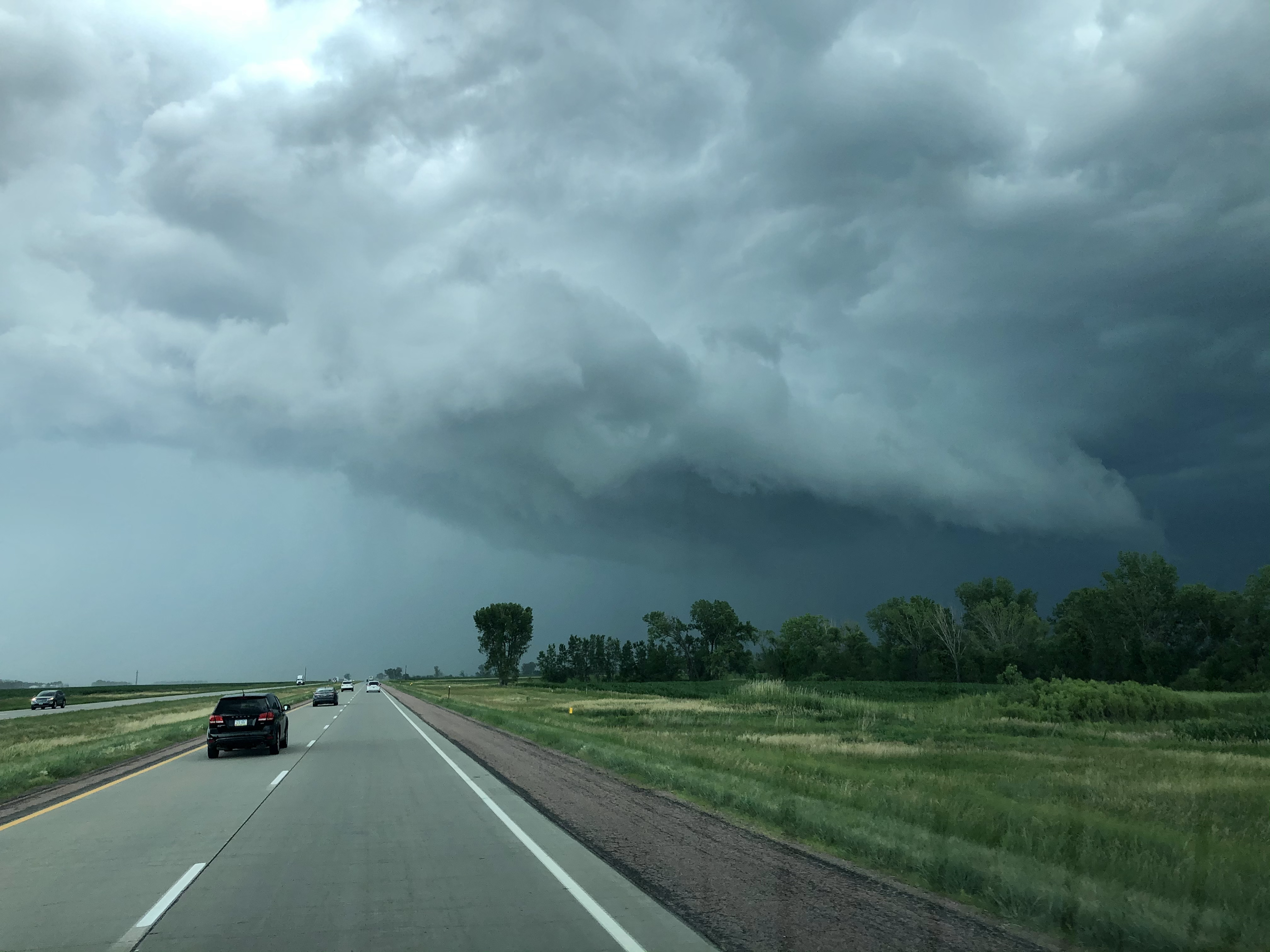 No dogs. No navigational duties. And UHaul is not lying when they call it a “gentle-ride van.” I listened to a podcast and watched Missouri morph into the shimmering corn stalks of Iowa. I called my grandma. Being a Iowan herself, and naturally vicarious where road trips are involved, she found our location on her atlas. Iowa became South Dakota and somewhere southeast of Vermillion, I watched a fast-moving storm transpire out of the clear blue day.