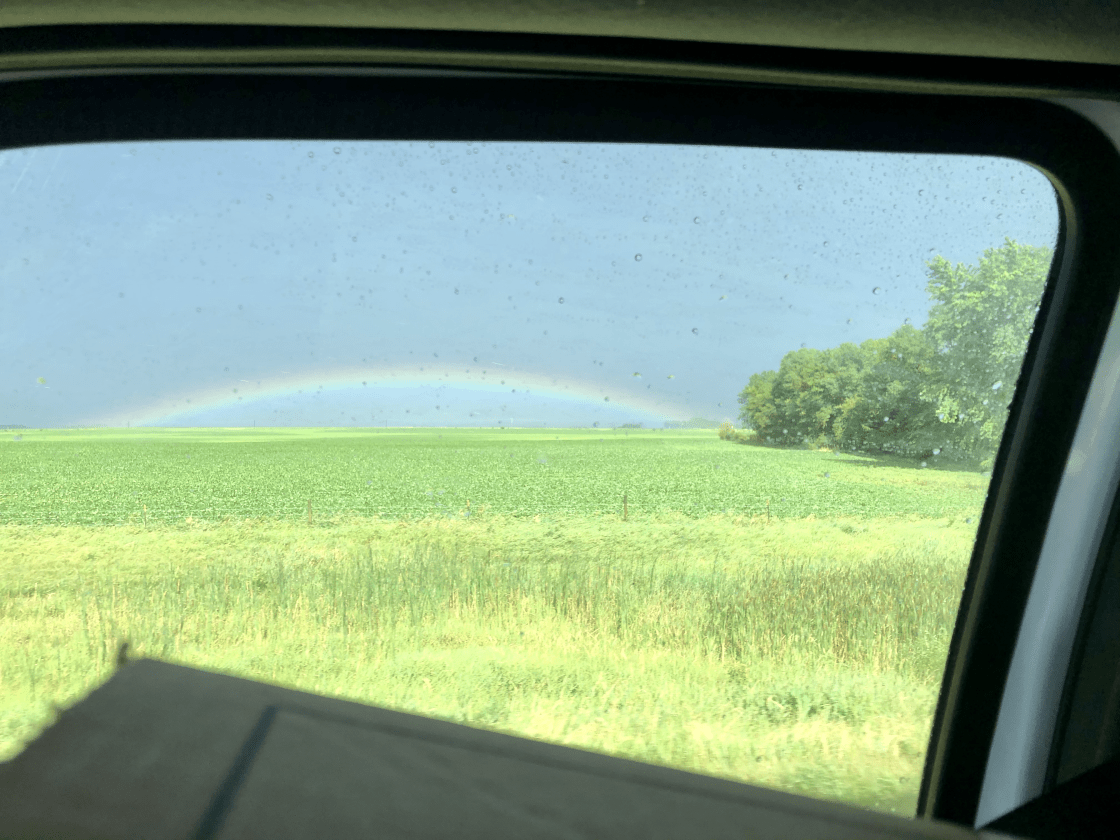 The world brightened as the storm barreled off into emerald fields which a low rainbow illuminated. Signs for Sioux Falls popped up.