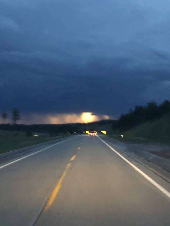 The Black Hills are enchanting in the rosy dusk hour when tall pines fade to deep greens and misty blues. Orange stone fades to white and then to shadow. I felt the engine break every once in a while and listened to the radio. Storm clouds blazed a dangerous black in the last light of day. Lightning made the radio crackle. Huge bolts touched down all over. God’s fireworks for America’s birthday. I caught sight of the Super Moon.