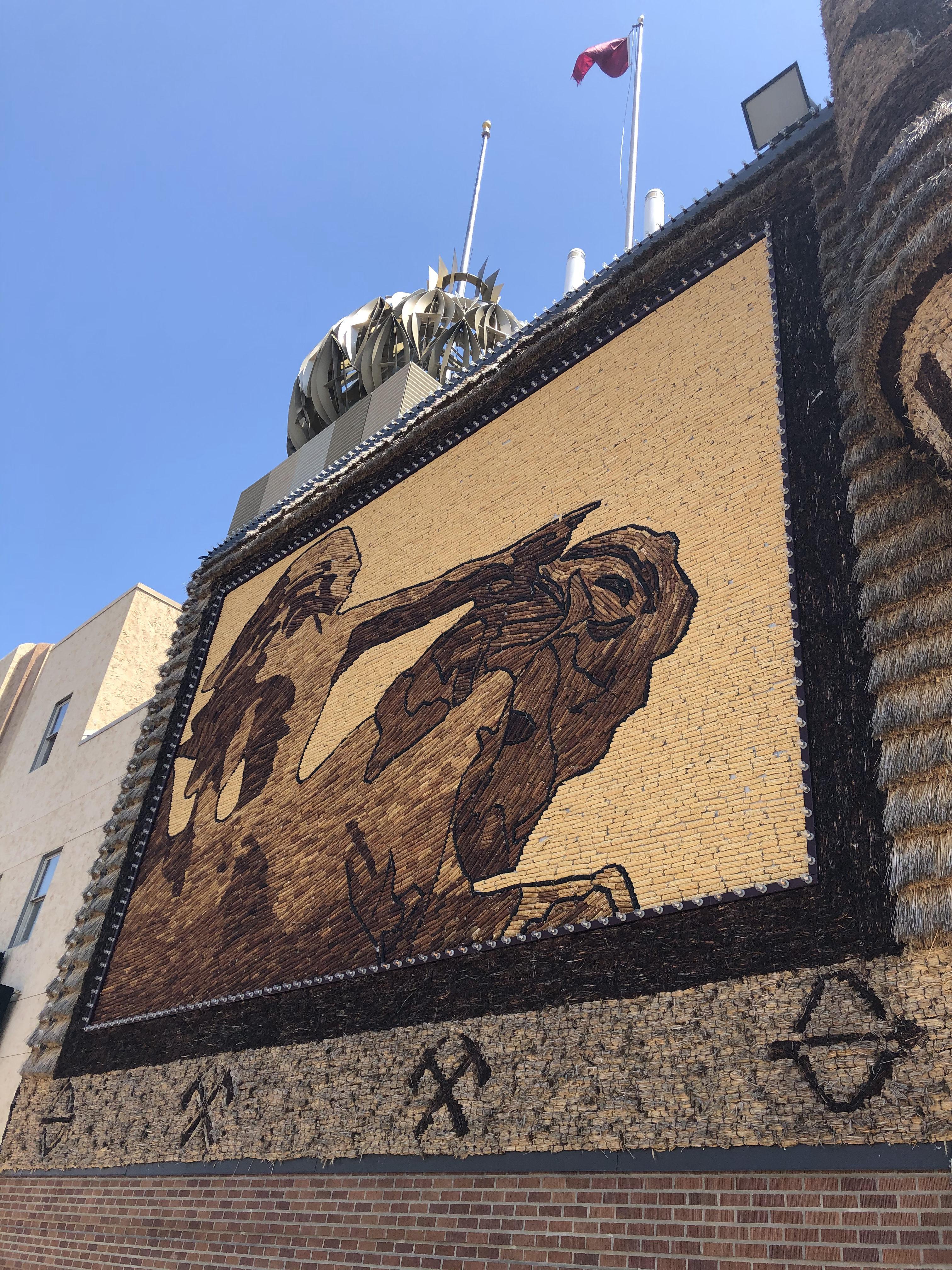 “Let’s stop at the Corn Palace real quick,” I requested an hour into the drive. We were at Mitchell and due for a pit stop anyway. We drove through town until I saw that old, infamous building which was swagged with a mural of Crazy Horse, one of its few actually finished scenes.