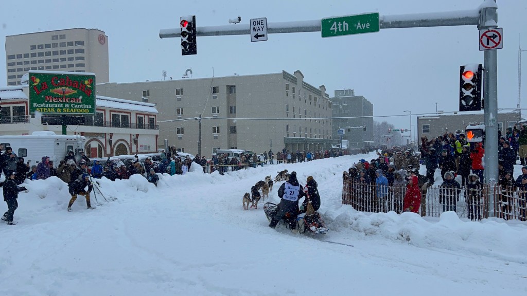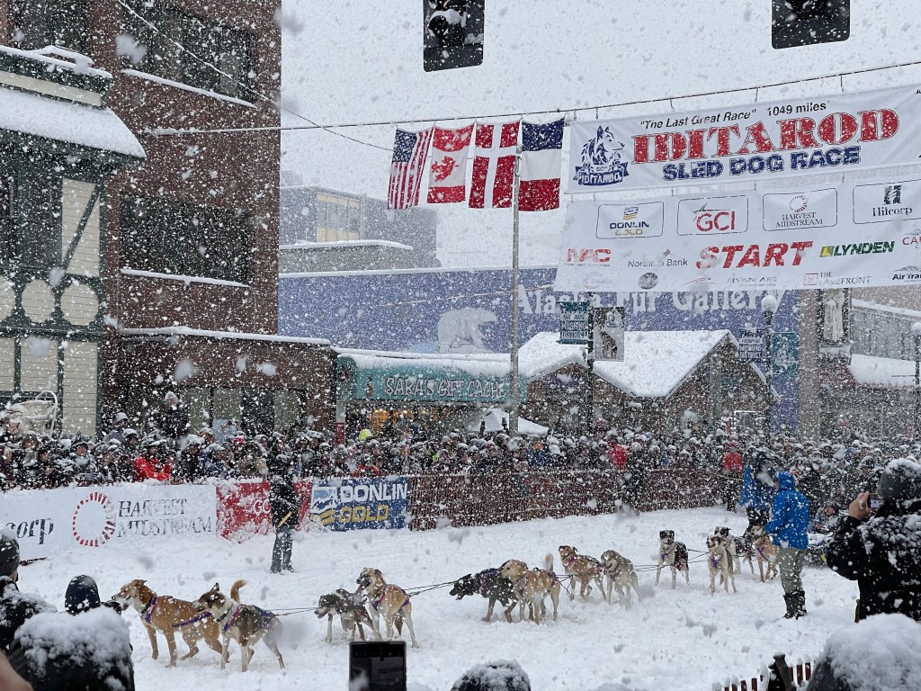 We walked west, from Cordova to the heart of the event: the starting line. The banner stretched across Fourth Avenue, from the Dog Mushing Hall of Fame to the Fourth Avenue Market Place across the street. The bark and yip of tiny dogs mingled with the swish of polyester jackets, the crunch of boots on new snow, ringing bells and exuberant hollers. A man counted down from ten. The first of forty-nine teams did not move.